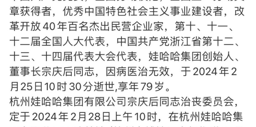 2024年2月25日11點,娃哈哈發(fā)布訃告:娃哈哈創(chuàng)始人、董事長宗慶后同志,因病醫(yī)治無效,于2024年2月25日10時30分逝世,享年79...