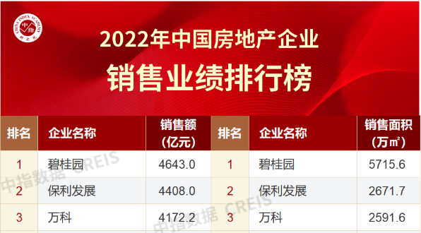 據(jù)中指數(shù)據(jù)統(tǒng)計,2022年銷售金額TOP10中,央國企就占據(jù)了5席,TOP3門檻更是在4千億以上,與第四名拉開了一千多億的差距。而作為央企龍頭,保利發(fā)展(600048)在行業(yè)艱難、市場成交面積萎縮的這一年里,更是逆勢增長;2022年位居全口徑銷售金額TOP2,與去年相比上升2個名次;位居全口徑銷售面積TOP2,與去年相比上升3個名次;在TOP10里面表現(xiàn)較為搶眼。