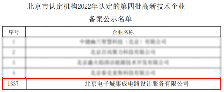 近日,全國高新技術(shù)企業(yè)認(rèn)定管理工作領(lǐng)導(dǎo)小組辦公室發(fā)布《2022年第四批國家高新技術(shù)企業(yè)認(rèn)證名單》,電子城(600658)高科科技研發(fā)服務(wù)重要支撐載體——電子城集成電路服務(wù)公司位列其中,正式邁入國家高新技術(shù)企業(yè)行列。