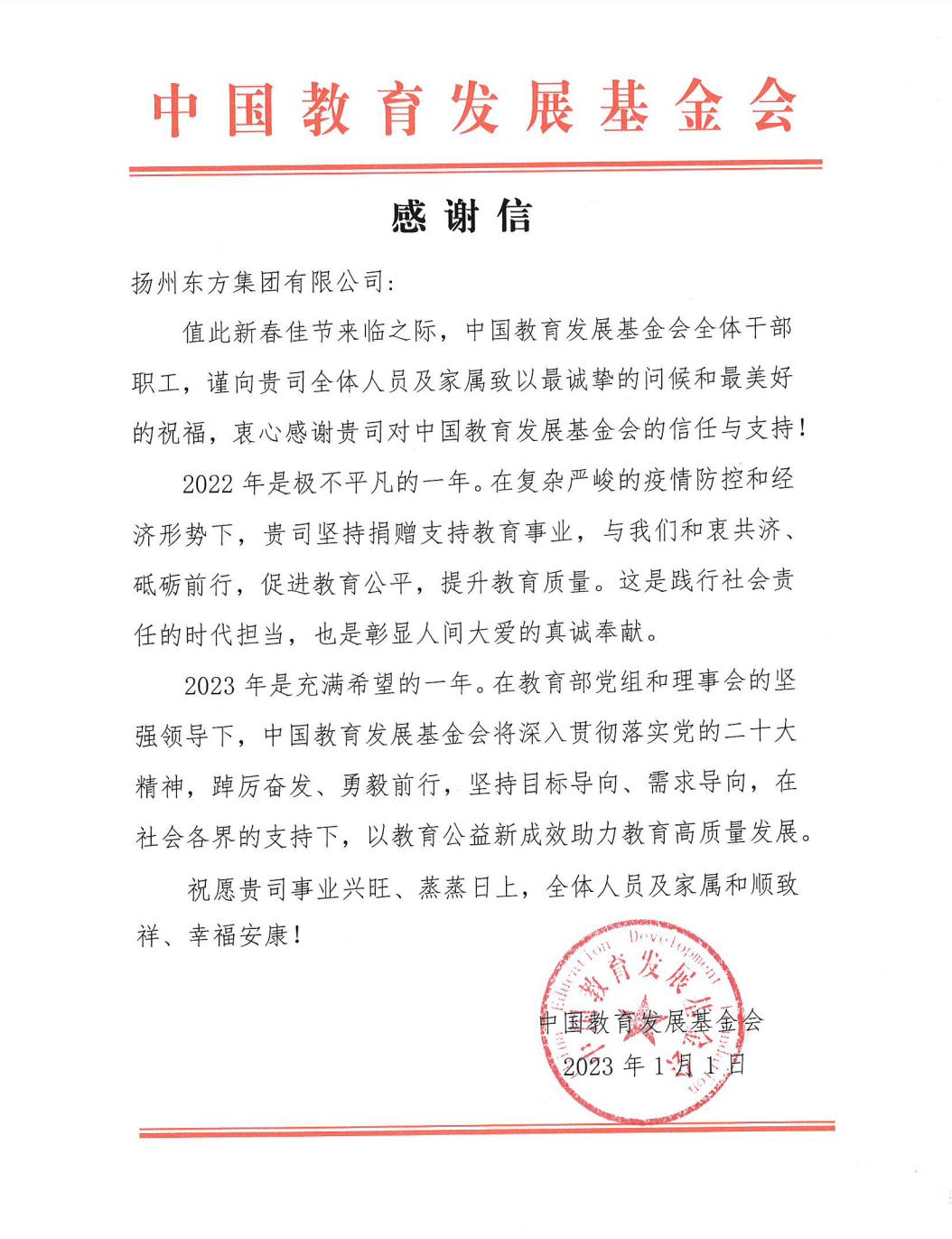中國教育發(fā)展基金會感謝易事特母公司揚州東方支持