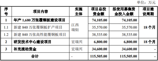 宏瑞興原擬在深交所主板公開(kāi)發(fā)行股票總量不超過(guò)3,333.3334萬(wàn)股,占發(fā)行后總股本的比例不低于25.00%。公司擬募集資金115,505.00萬(wàn)元,分別用于年產(chǎn)1,680萬(wàn)張覆銅板建設(shè)項(xiàng)目、研發(fā)技術(shù)中心建設(shè)項(xiàng)目、補(bǔ)充流動(dòng)資金。