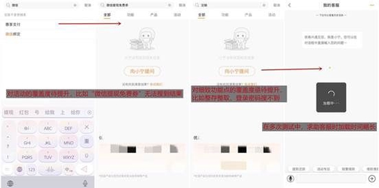 相比2021年評測,搜索體驗提升不大,仍需進(jìn)一步優(yōu)化:一是,關(guān)鍵詞測試中,諸如登錄密碼、注銷、整存整取等細(xì)致功能搜不到結(jié)果;二是,對活動的覆蓋度待提升,比如熱榜中的“微信提現(xiàn)免費券”無法搜到結(jié)果;三是,若用戶求助智能客服,載入時間比較長。