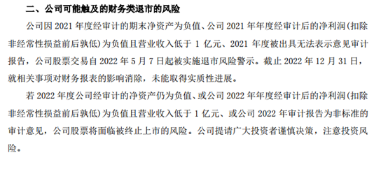 1月16日,*ST金洲發(fā)布公告稱,公司因2021年度經(jīng)審計的期末凈資產(chǎn)為負(fù)值、公司2021年年度經(jīng)審計后的凈利潤(扣除非經(jīng)常性損益前后孰低)為負(fù)值且營業(yè)收入低于1億元、2021年度被出具無法表示意見審計報告。截至2022年12月31日,就相關(guān)事項(xiàng)對財務(wù)報表的影響消除,未能取得實(shí)質(zhì)性進(jìn)展,*ST金洲大概率將在2022年年報披露后,因非標(biāo)審計意見而觸及財務(wù)類強(qiáng)制退市情形。