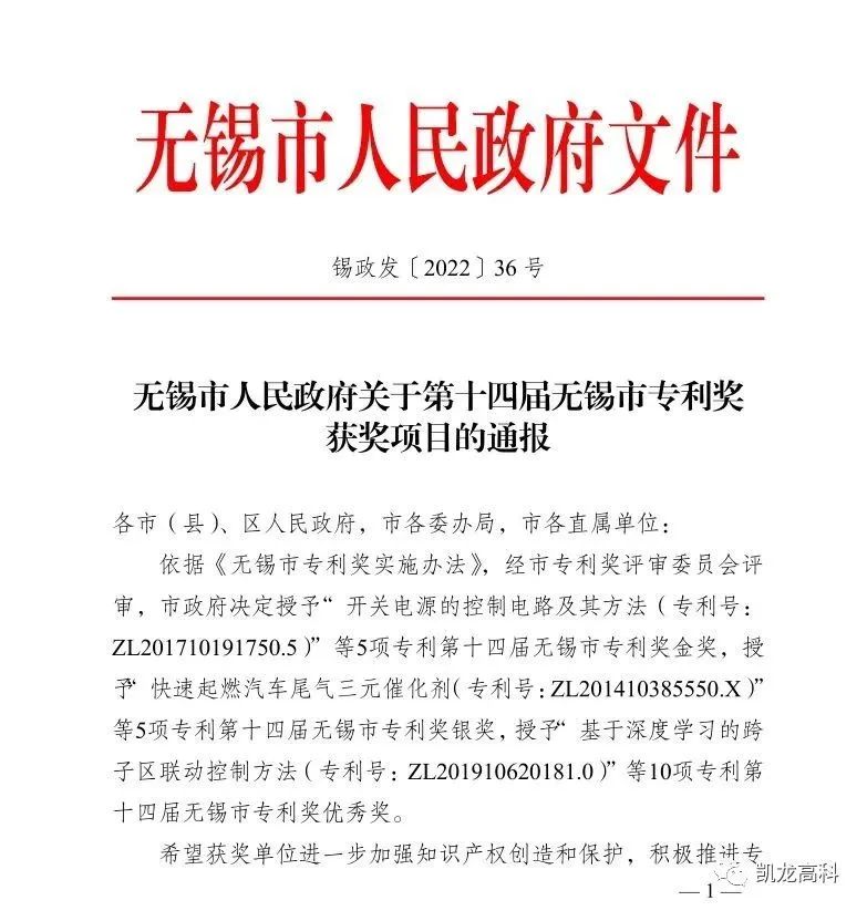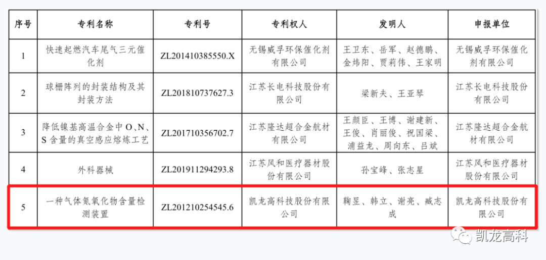凱龍高科(300912)技股份有限公司憑借“一種氣體氮氧化物含量檢測裝置(專利號:ZL201210254545.6)”,榮獲第十四屆無錫市專利獎銀獎。