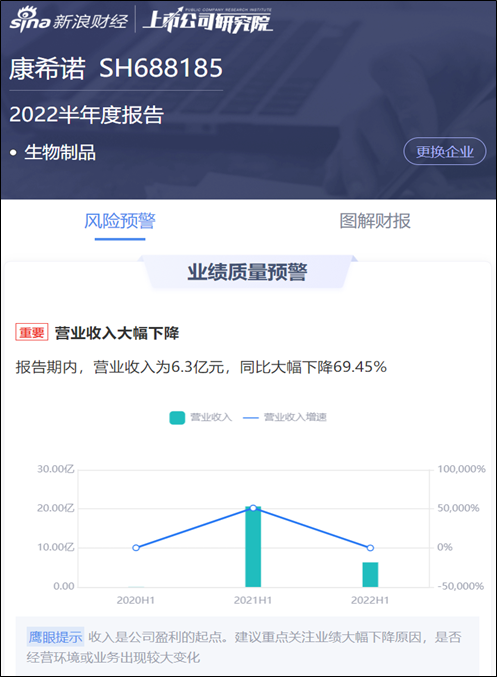 以上均可以從康希諾2022年半年報得到驗證。鷹眼預(yù)警顯示,2022年半年報報告期內(nèi),公司營業(yè)收入為6.3億元,同比大幅下降69.45%。對此,鷹眼預(yù)警發(fā)出提示,建議重點關(guān)注公司業(yè)績大幅下降原因,是否經(jīng)營環(huán)境或業(yè)務(wù)出現(xiàn)較大變化。