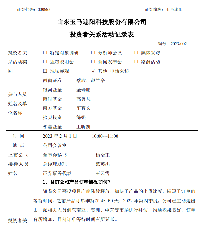 中國(guó)財(cái)富通2月3日 - 玉馬遮陽(yáng)(300993)(300993)在最新披露的投資者關(guān)系活動(dòng)記錄表中表示,隨著公司募投項(xiàng)目產(chǎn)能陸續(xù)釋放,加快了產(chǎn)品的出貨速度,縮短了訂單的等待時(shí)間,之前產(chǎn)品訂單維持在45-60天;2022年第四季度,公司已主動(dòng)走出去,派相關(guān)人員到東南亞、美洲、中東等市場(chǎng)進(jìn)行拜訪,溝通效果良好,訂單有所增加,目前訂單等待時(shí)間有所延長(zhǎng)。