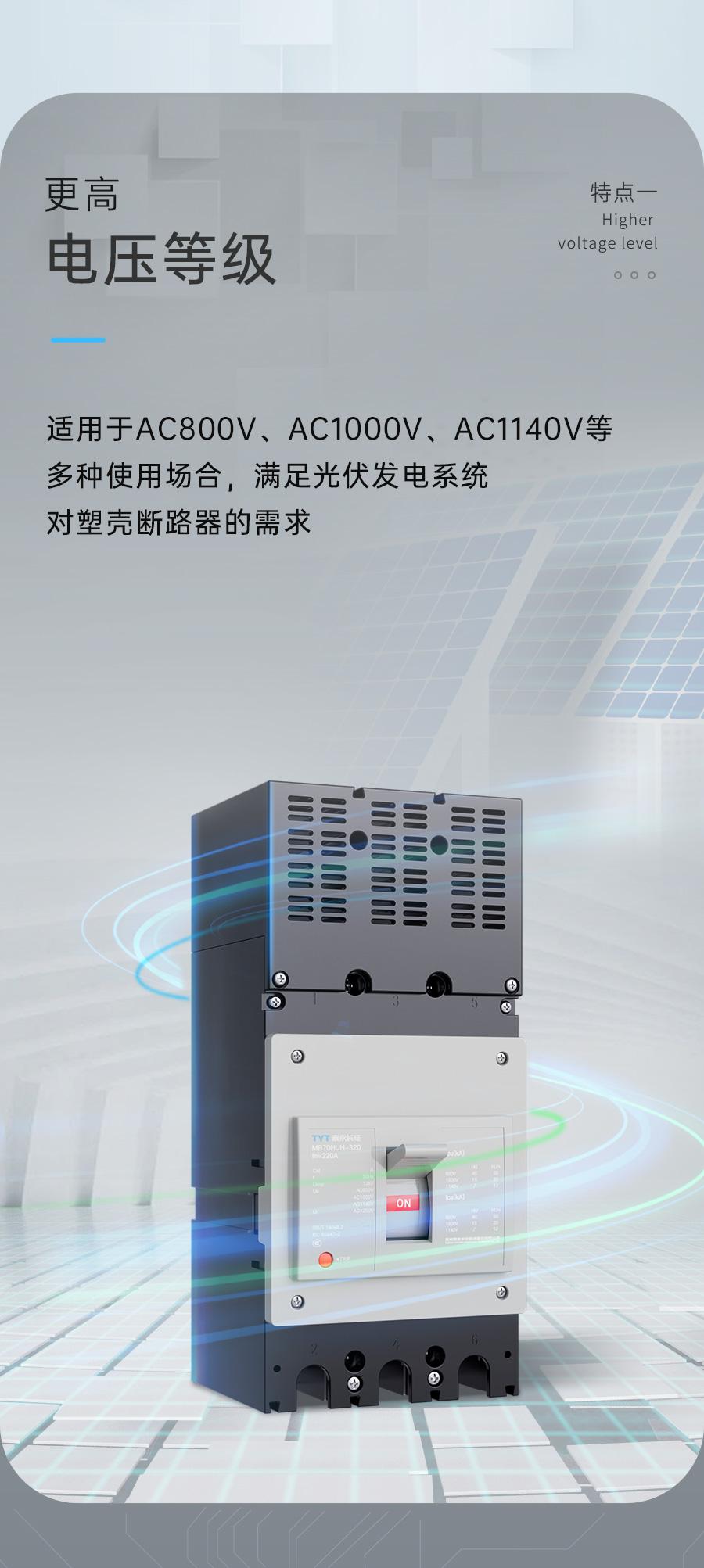光伏發(fā)電更高的電壓意味著更低的成本但同時(shí)也對(duì)配電產(chǎn)品提出了更高的性能、耐壓和可靠性要求針對(duì)行業(yè)發(fā)展趨勢(shì)TYT泰永長(zhǎng)征推出MB70HUH系列智慧物聯(lián)高電壓塑殼斷路器做好光伏電站安全“守門員”TYT泰永長(zhǎng)征MB70HUH系列智慧物聯(lián)高電壓塑殼斷