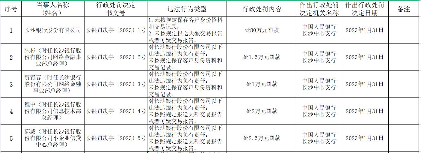 北京2月9日訊央行長沙中心支行網(wǎng)站近日公布的行政處罰信息公示表(長銀罰決字〔2023〕1號、2號、3號、4號、5號)顯示,長沙銀行(601577)股份有限公司未按規(guī)定保存客戶身份資料和交易記錄;未按規(guī)定報(bào)送大額交易報(bào)告或者可疑交易報(bào)告。中國人民銀行長沙中心支行對其處80萬元罰款。