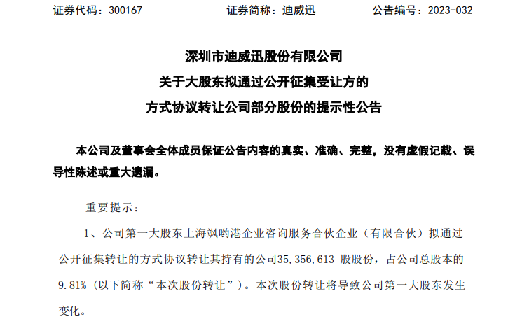 2月8日,迪威迅(300167)收到第一大股東上海颯喲港企業(yè)咨詢服務(wù)合伙企業(yè)(有限合伙)(下稱“上海颯喲港”)的通知,上海颯喲港擬以公開征集轉(zhuǎn)讓的方式,協(xié)議轉(zhuǎn)讓其所持有公司3535.7萬股股份(占公司總股本9.81%),本次公開征集轉(zhuǎn)讓的價格不低于5.80元/股。