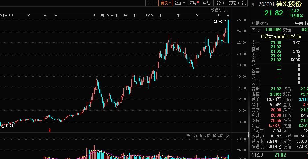 今日早盤,德宏股份(603701)高開后迅速跳水,一分鐘內(nèi)由開盤的漲7.26%變?yōu)榈?.11%,瞬間跌幅超過16%。截至午間收盤,德宏股份封死跌停板,早盤振幅達(dá)到17.24%,主力資金凈流出超過5000萬元。