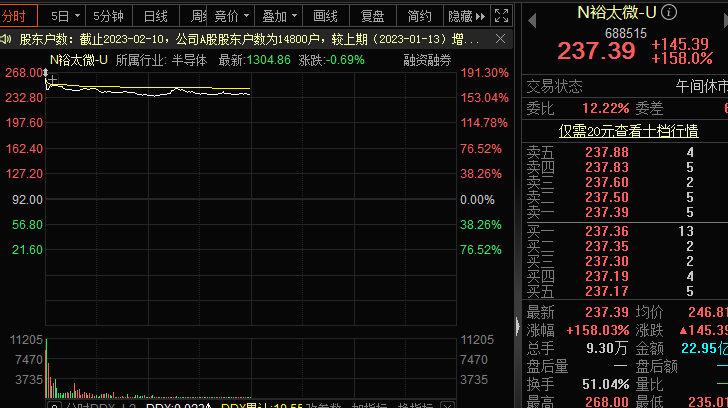 科創(chuàng)板新股裕太微今日上市,早盤以182.61%的漲幅大幅高開,盤中最高漲幅190%以上,截至收盤報價237.39元/股,上漲158.03%。按早盤最高股價268元/股計算,打新的投資者中一簽可賺8.8萬元,這也使得裕太微成為2023年第一大肉簽。