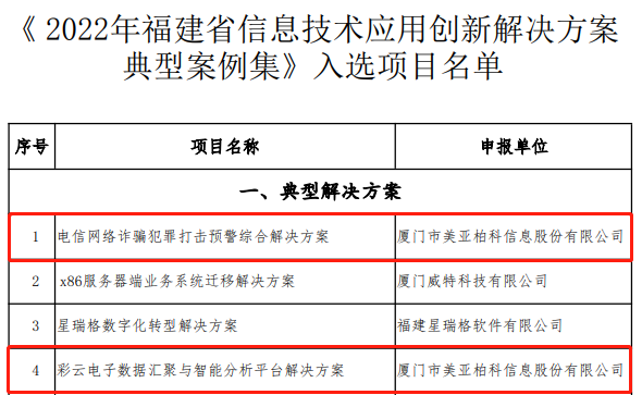近日,福建省數(shù)字福建建設(shè)領(lǐng)導(dǎo)小組辦公室公布關(guān)于《2022年福建省信息技術(shù)應(yīng)用創(chuàng)新解決方案典型案例集》入選項目名單。經(jīng)過材料初篩、專家評審、網(wǎng)上公示等程序嚴(yán)格篩選,美亞柏科(300188)“電信網(wǎng)絡(luò)詐騙犯罪打擊預(yù)警綜合解決方案”、“彩云電子數(shù)據(jù)匯聚與智能分析平臺解決方案”入選典型解決方案。