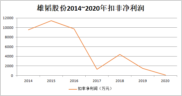 此外,從2014年至2020年,公司實(shí)現(xiàn)扣非凈利潤(rùn)分別為9503萬(wàn)元、1.14億元、9659.90萬(wàn)元、1314.42萬(wàn)元、4382.56萬(wàn)元、1502.94萬(wàn)元、98.58萬(wàn)元,同比變動(dòng)幅度為18.93%、20.18%、-15.42%、-86.39%、233.42%、-65.71%、-93.44%。