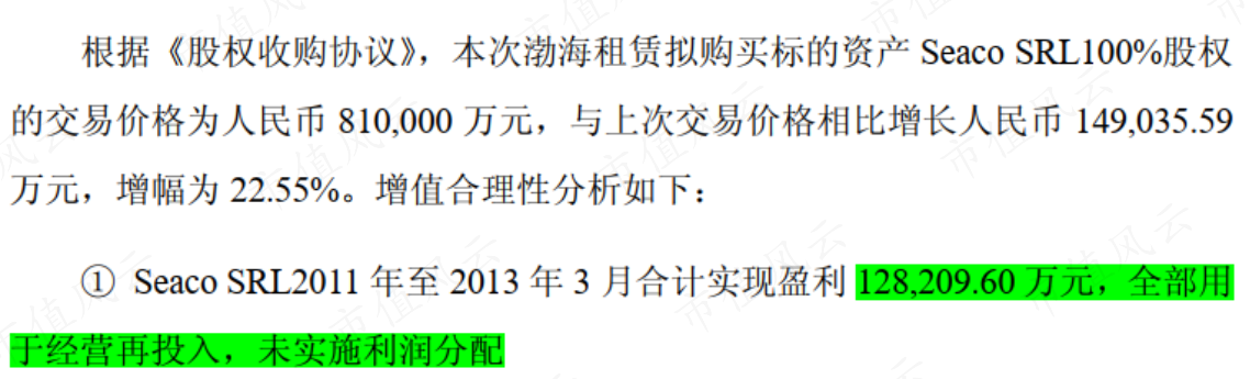 2013年9月,渤海租賃又以81億總對價自海航集團手中取得Seaco SRL100%股權,其中支付現(xiàn)金高達72億,另承接9億債務,并募集35億元配套資金。