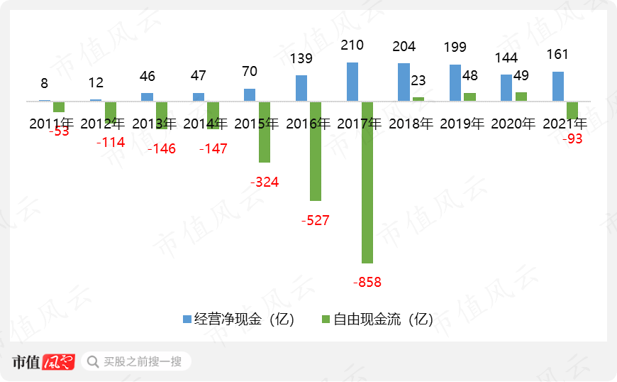 (本圖中自由現(xiàn)金=經(jīng)營凈現(xiàn)金+資產處置-資產購置-子公司并購-支付的購機保證金。制圖:市值風云APP)