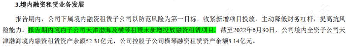 截至2022年6月30日,渤海租賃境內全資子公司天津渤海境內融資租賃資產余額52.31億元,公司控股子公司橫琴融資租賃資產余額3.14億元。
