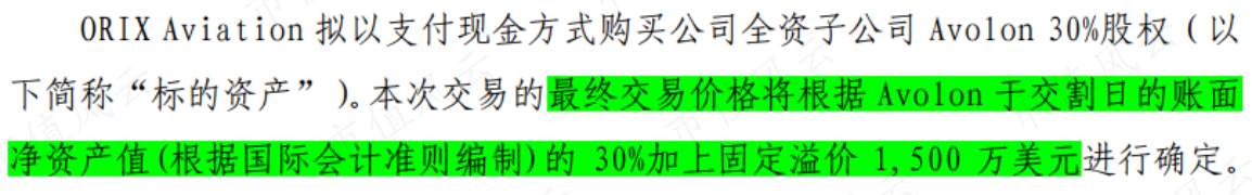 以Avolon為例,2018年8月,取得Avolon 100%股權兩年后,渤海租賃為降低資產負債率,對外轉讓Avolon 30%的股權,而此時定價依據(jù)是Avolon交割日賬面凈資產的30%加固定溢價1,500萬美元。