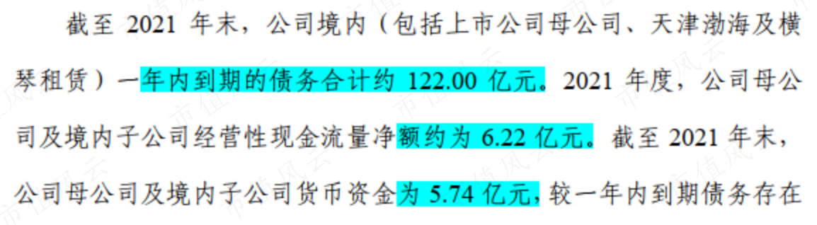 而當年末僅一年內到期的債務就高達122億元,根本沒法還。