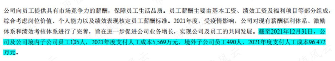 而管理層工資遠低于職工平均工資,也是由業(yè)務主要在境外開展導致的:以2021年為例,境內員工105人,人均工資成本53萬;境外員工490人,人均工資成本197萬。