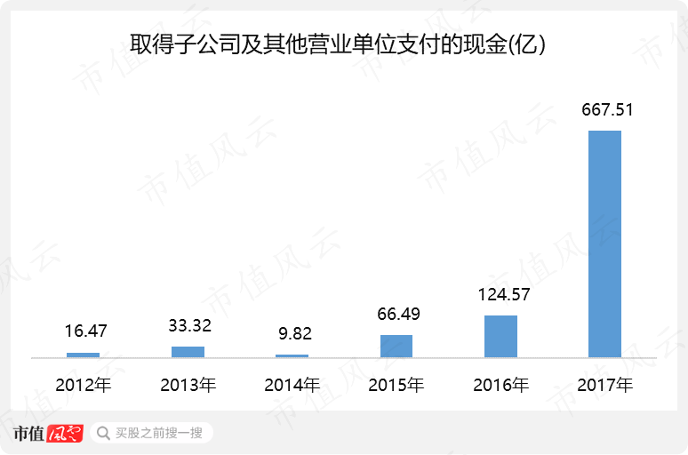 2012至2017年,單單在現(xiàn)金流量表中列示的,取得子公司及其他營業(yè)單位支付的現(xiàn)金就高達918億。