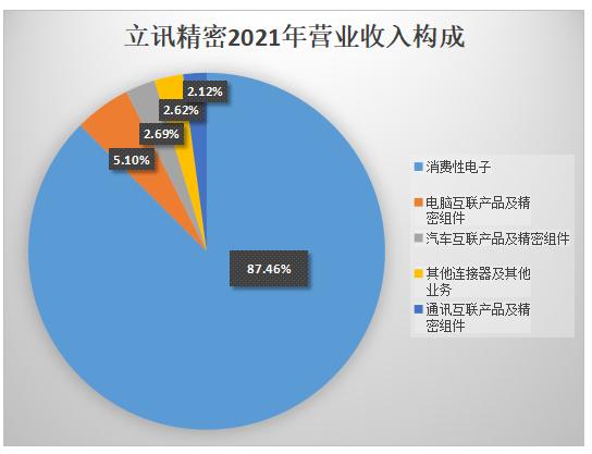 立訊精密以做傳統(tǒng)連接線、連接器起家。公司研發(fā)、制造及銷售的產(chǎn)品主要服務(wù)于消費(fèi)電子、通信及數(shù)據(jù)中心、汽車電子和醫(yī)療等領(lǐng)域。其中消費(fèi)電子是立訊精密長期以來營業(yè)收入的主要組成部分,2021年消費(fèi)性電子收入占其營業(yè)收入的87.46%。