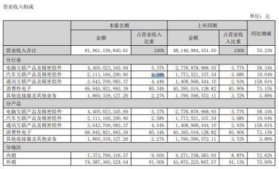 雖然立訊精密已經(jīng)開始在汽車領(lǐng)域發(fā)力,但是從2022年上半年的營業(yè)收入構(gòu)成來看,汽車部分的業(yè)務(wù)收入占比依然較低。2022年上半年,立訊精密汽車部分的業(yè)務(wù)收入仍然只有21.11億元,營業(yè)收入占比只有2.58%。消費(fèi)電子部分的營業(yè)收入占比依然高達(dá)85.34%。