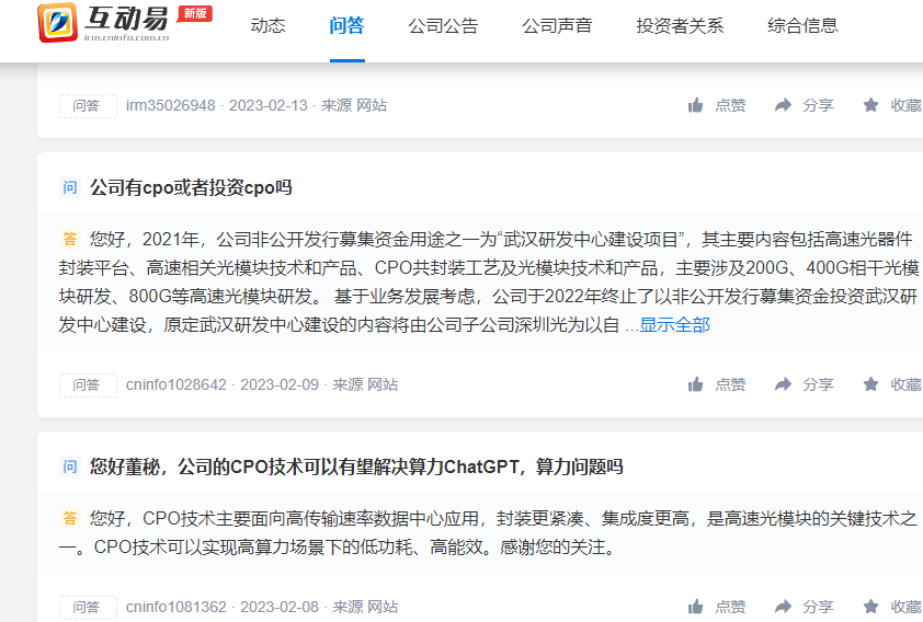 此外,對(duì)于“CPO”“ChatGPT”的相關(guān)問(wèn)題,通宇通訊與投資者有多次互動(dòng)。