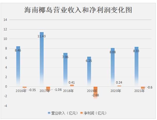 2016-2021年,海南椰島的營業(yè)收入分別為8.46億元、11.43億元、7.06億元、6.25億元、8.08億元、8.33億元;凈利潤分別為-3525.01萬元、-1.06億元、4051.33萬元、-2.68億元、2430.88萬元、-6014.09萬元。