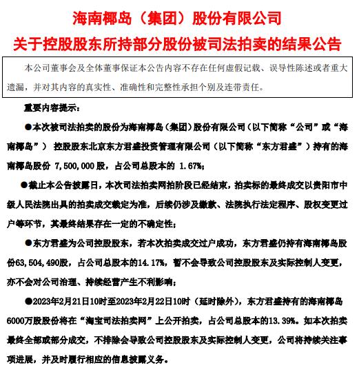 來源:海南椰島關(guān)于控股股東所持部分股份被司法拍賣的結(jié)果公告
