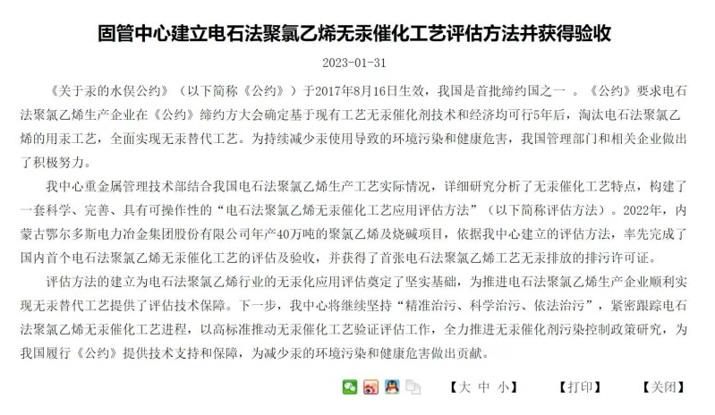 ▲2023年1月,國家環(huán)境部固管中心官網(wǎng)發(fā)布新聞《固管中心建立電石法聚氯乙烯無汞催化工藝評(píng)估方法并獲得驗(yàn)收》。