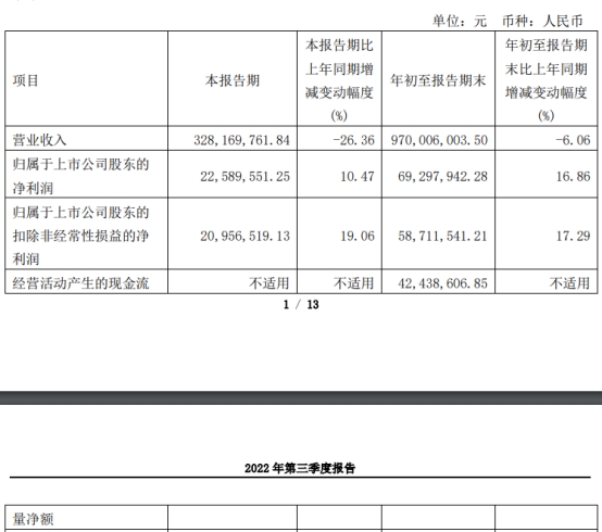 去年第三季度,公司實(shí)現(xiàn)營業(yè)收入328,169,761.84元,同比下降26.36%;實(shí)現(xiàn)歸屬于上市公司股東的凈利潤22,589,551.25元,同比增長10.47%;實(shí)現(xiàn)歸屬于上市公司股東的扣除非經(jīng)常性損益的凈利潤20,956,519.13元,同比增長19.06%。