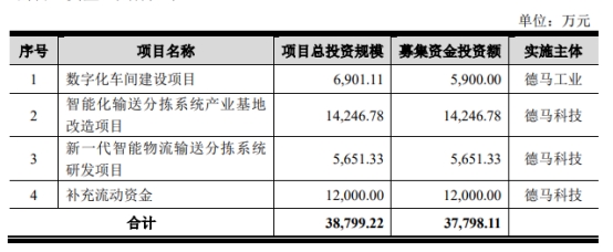 德馬科技募集資金總額為53,804.90萬元,募集資金凈額為46,093.62萬元,較原擬募資多8295.51萬元。德馬科技此前披露的招股書顯示,公司原擬募資37,798.11萬元,分別用于數(shù)字化車間建設(shè)項(xiàng)目、智能化輸送分揀系統(tǒng)產(chǎn)業(yè)基地改造項(xiàng)目、新一代智能物流輸送分揀系統(tǒng)研發(fā)項(xiàng)目、補(bǔ)充流動(dòng)資金。