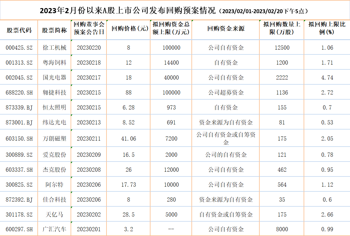 值得一提的是,2023年2月份以來(lái),已有13家上市公司披露了股份回購(gòu)預(yù)案。其中徐工機(jī)械和翱捷科技(688220.SH)擬回購(gòu)資金總額上限均為10億元,是回購(gòu)預(yù)案中擬回購(gòu)資金總額上限最高的。從各上市公司擬回購(gòu)的比例來(lái)看,國(guó)光電器(002045)(002045.SZ)的擬回購(gòu)上限比例最高,占其公司總股本的比例為4.74%。此外,從各上市公司的回購(gòu)資金來(lái)源看,資金主要來(lái)源于公司自有資金或者自籌資金,僅有翱捷科技擬回購(gòu)資金來(lái)源于公司超募資金。
