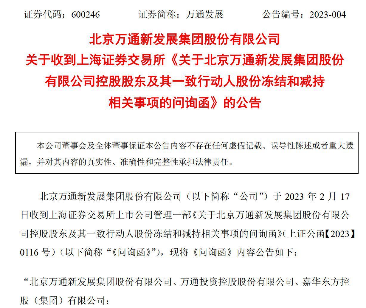 2023年2月18日,萬通發(fā)展(600246)收到上海證券交易所《關(guān)于北京萬通新發(fā)展集團(tuán)股份有限公司控股股東及其一致行動人股份凍結(jié)和減持相關(guān)事項(xiàng)的問詢函》,問詢函載明,“上海證券交易所上市公司管理一部多次督促并于2月13日向你公司發(fā)出監(jiān)管工作函,要求核實(shí)相關(guān)情況并及時(shí)履行信息披露義務(wù)。截至2023年2月17日,你公司仍未披露相關(guān)公告。2月17日,公司公告顯示,控股股東及其一致行動人近期通過大宗交易累計(jì)減持公司股份2117萬股,占公司總股本的1.03%?!?/p>