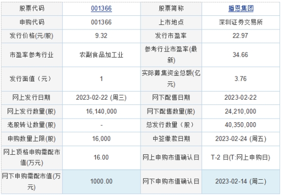 播恩集團(tuán)2023年2月21日披露的首次公開(kāi)發(fā)行股票發(fā)行公告顯示,按本次發(fā)行價(jià)格9.32元/股計(jì)算,公司預(yù)計(jì)募集資金37,606.20萬(wàn)元,扣除發(fā)行費(fèi)用5,700.70萬(wàn)元后,預(yù)計(jì)募集資金凈額為31,905.50萬(wàn)元。