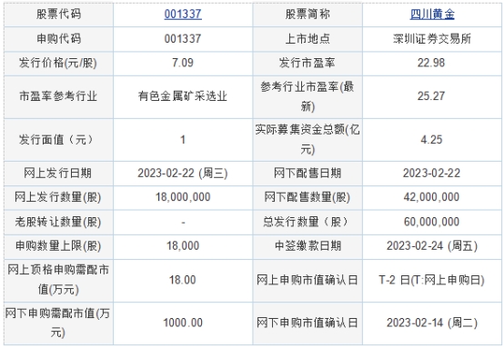 四川黃金2023年2月21日披露的首次公開(kāi)發(fā)行股票發(fā)行公告顯示,按本次發(fā)行價(jià)格7.09元/股,公司預(yù)計(jì)募集資金42,540.00萬(wàn)元,扣除預(yù)計(jì)發(fā)行費(fèi)用3,517.29萬(wàn)元后,預(yù)計(jì)募集資金凈額為39,022.71萬(wàn)元。