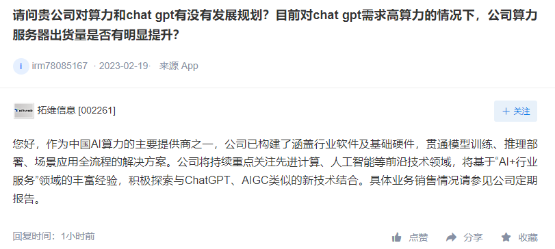 中國財富通2月22日 - 拓維信息(002261)(002261)在互動平臺上表示,作為中國AI算力的主要提供商之一,公司已構(gòu)建了涵蓋行業(yè)軟件及基礎(chǔ)硬件,貫通模型訓(xùn)練、推理部署、場景應(yīng)用全流程的解決方案。公司將持續(xù)重點關(guān)注先進計算、人工智能等前沿技術(shù)領(lǐng)域,將基于“AI+行業(yè)服務(wù)”領(lǐng)域的豐富經(jīng)驗,積極探索與ChatGPT、AIGC類似的新技術(shù)結(jié)合。