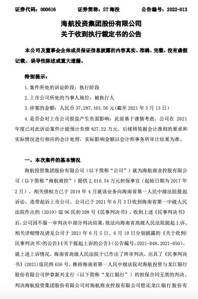 海航投資集團股份有限公司(以下簡稱“ST海投(000616)”或“公司”)2月23日發(fā)布關(guān)于收到執(zhí)行裁定書的公告。公告稱,公司于2023年2月20日收到由海南省人民檢察院送達(dá)的《通知書》,海南省人民檢察院受理因龍江銀行伊春新興支行不服海南省高級人民法院“龍江銀行金融借款合同糾紛案”民事判決向海南省人民檢察院申請監(jiān)督該案。公司于2023年2月21日收到海南省第一中級人民法院發(fā)來的《執(zhí)行裁定書》,海南省第一中級人民法院裁定駁回公司關(guān)于請求法院依法駁回龍江銀行的執(zhí)行申請的異議請求。本次涉案的金額:人民幣 37,287,163.56 元(截至 2021 年 3 月 13 日)。