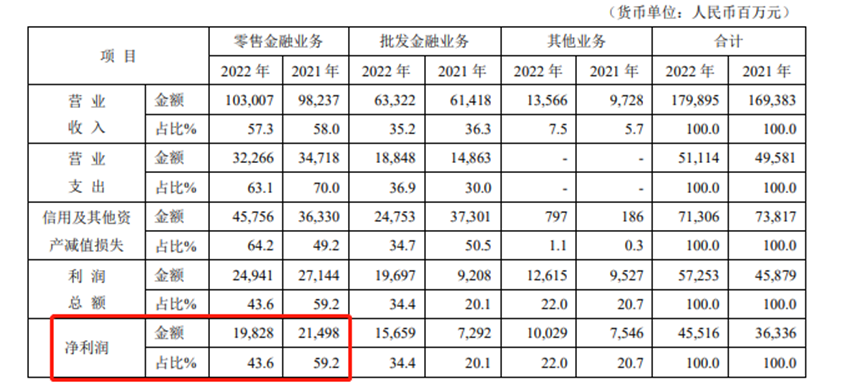 不過,2022年該行的零售業(yè)務利潤和利潤占比都出現了下滑。