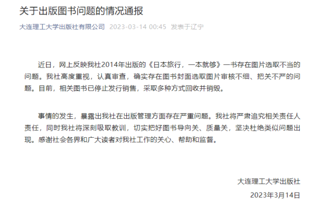 近日,網(wǎng)上反映我社2014年出版的《日本旅行,一本就夠》一書存在圖片選取不當?shù)膯栴}。我社高度重視,認真審查,確實存在圖書封面選取圖片審核不細、把關(guān)不嚴的問題。目前,相關(guān)圖書已停止發(fā)行銷售,采取多種方式回收并銷毀。