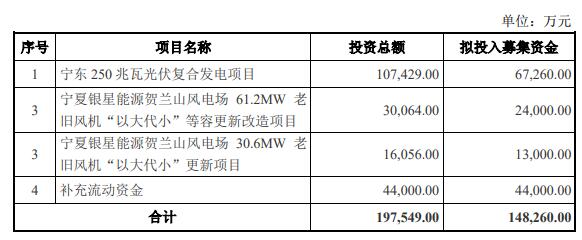 昨晚,銀星能源發(fā)布向特定對象發(fā)行A股股票預案。銀星能源本次向特定對象發(fā)行股票擬募集資金總額不超過148,260萬元,扣除發(fā)行費用后的募集資金凈額將用于寧東250兆瓦光伏復合發(fā)電項目、寧夏銀星能源賀蘭山風電場61.2MW老舊風機“以大代小”等容更新改造項目、寧夏銀星能源賀蘭山風電場30.6MW老舊風機“以大代小”更新項目、補充流動資金。