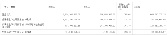 公司2022年實(shí)現(xiàn)營業(yè)收入達(dá)到20億元,同比增長108%,跟2020年相比更是大增超200%;實(shí)現(xiàn)凈利潤10.52億元,實(shí)現(xiàn)扣非凈利潤9.95億元,上述數(shù)據(jù)同比和與2020年相比的增速分別為274%、459%及307%、690%。