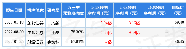 數據中心根據近三年發(fā)布的研報數據計算,中郵證券王磊研究員團隊對該股研究較為深入,近三年預測準確度均值為78.36%,其預測2023年度歸屬凈利潤為盈利6.86億,根據現價換算的預測PE為9.04。