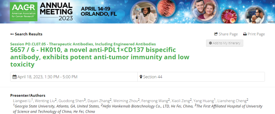 臨床前研究表明,HK010在動物腫瘤模型中顯示了強(qiáng)效的抗腫瘤活性。該雙抗增加兩個分子之間的親和力差異、弱化Fc功能,可以很好地平衡藥效和毒性,在猴子毒理研究中展現(xiàn)了極佳的安全性。HK010注射液已經(jīng)獲得了臨床試驗(yàn)批件,并即將進(jìn)行首次人體試驗(yàn)。本次會議海報將展示HK010最新臨床前數(shù)據(jù),歡迎業(yè)界同仁前來交流。