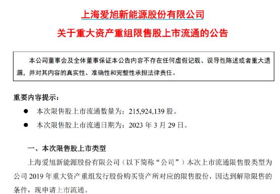 電池片龍頭愛(ài)旭股份(600732)(600732)將在3月29日解禁2.16億股限售股,這部分股票為公司實(shí)控人陳剛及其一致行動(dòng)人自2019年的重組而持有。在禁售期內(nèi),愛(ài)旭股份經(jīng)歷了業(yè)績(jī)不達(dá)標(biāo)、股東業(yè)績(jī)補(bǔ)償?shù)取安迩?,最終這部分股份在三年半后得以解鎖。
