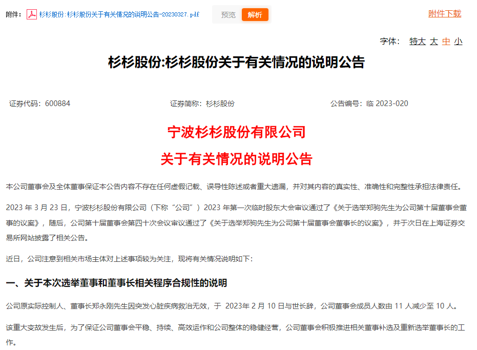 3月26日下午,杉杉股份發(fā)布最新公告作出說明,“公司本次提名和選舉鄭駒先生為公司第十屆董事會非獨立董事,并出任公司董事長的程序符合相關(guān)法律法規(guī)和《公司章程》的相關(guān)規(guī)定,本次選舉合法有效。”