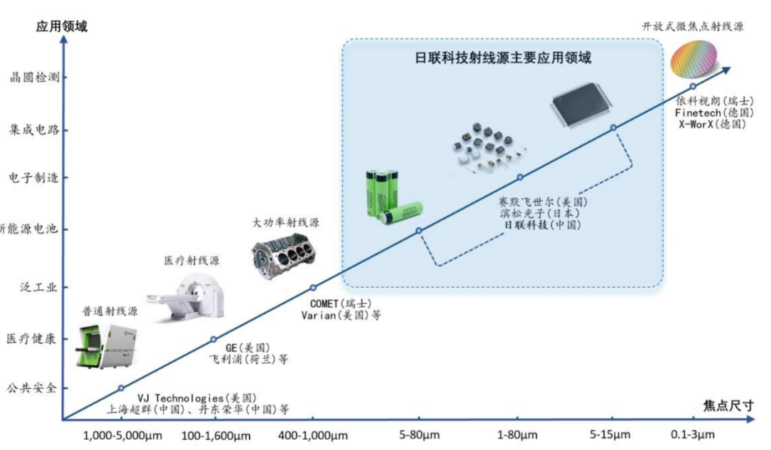 X射線源陰極發(fā)射的電子被聚焦到靶上的一個(gè)點(diǎn),稱之為焦點(diǎn),焦點(diǎn)的尺寸越小,則檢測精度越高。因X射線能量高、穿透力強(qiáng)等特點(diǎn)廣泛應(yīng)用于醫(yī)療健康和工業(yè)影像檢測等領(lǐng)域。在集成電路、電子制造、新能源電池等精密制造領(lǐng)域,為滿足高精度檢測要求,須配置微米級、納米級焦點(diǎn)尺寸X射線源,即微焦點(diǎn)X射線源。