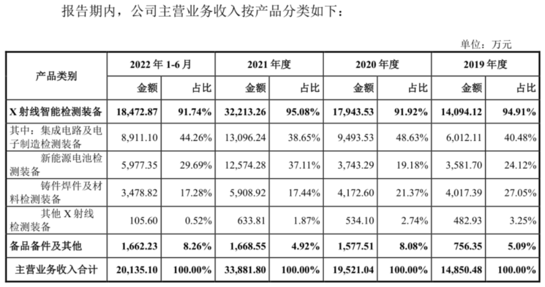 招股資料顯示,目前,公司主營業(yè)務(wù)中X射線智能檢測裝備占比到90%以上,是公司核心業(yè)務(wù),其中集成電路及電子制造檢測裝備2022上半年占比44%,新能源電池檢測裝備占比30%,鑄件焊件及材料檢測裝備占比17%。