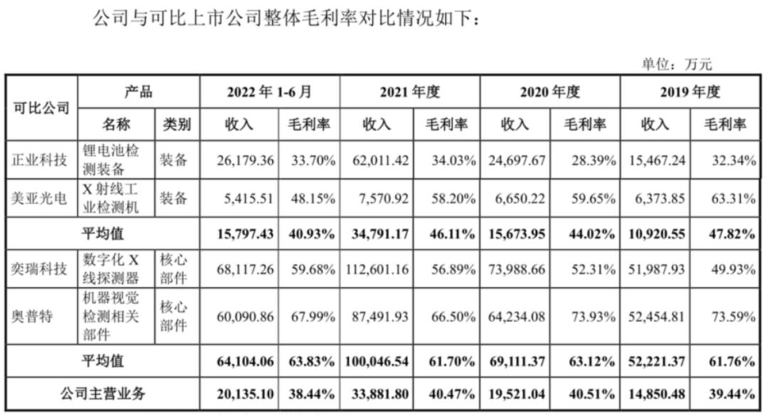 毛利率水平更是被同行拉開巨大差距。數(shù)據(jù)顯示,日聯(lián)科技2019-2021年及2022上半年主營業(yè)務(wù)毛利率分別為39.44%、40.51%、40.47%和38.44%,同一時(shí)期同業(yè)裝備毛利率的平均值為47.82%、44.02%、46.11%、40.93%,核心部件的毛利率平均值 61.76%、63.12%、61.7%、63.83%,均拉開日聯(lián)科技數(shù)個(gè)身位,最大差值超過了25個(gè)百分點(diǎn)。