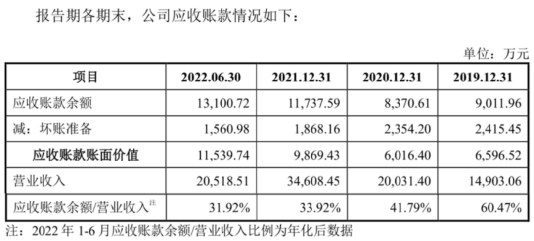 2019-2021年及2022上半年,公司應(yīng)收賬款賬余額分別為9011.96萬元、8370.61萬元、1.17億元和1.31億元,占當(dāng)期營業(yè)收入的比例分別為60.47%、41.79%、33.92%、31.92%;其中壞賬準(zhǔn)備分別為2415.45萬元、2354.2萬元、1868.16萬元和1560.98萬元,相比于各期凈利潤831.84萬元、2137.62萬元、5081.59萬元和2108.01萬元而言,占據(jù)著極大的比例。